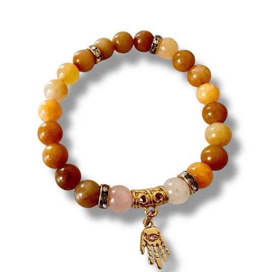 “Golden Grace” Bracelet – Yellow Aventurine, Rose Quartz & Hamsa Charm (Gold-Plated)