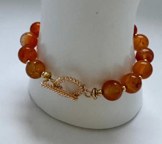 “Inner Flame” Carnelian Bracelet – 10mm Gemstones with Gold-Plated Clasp