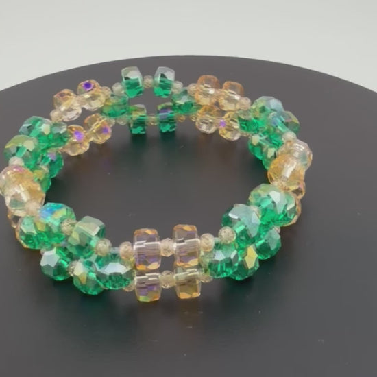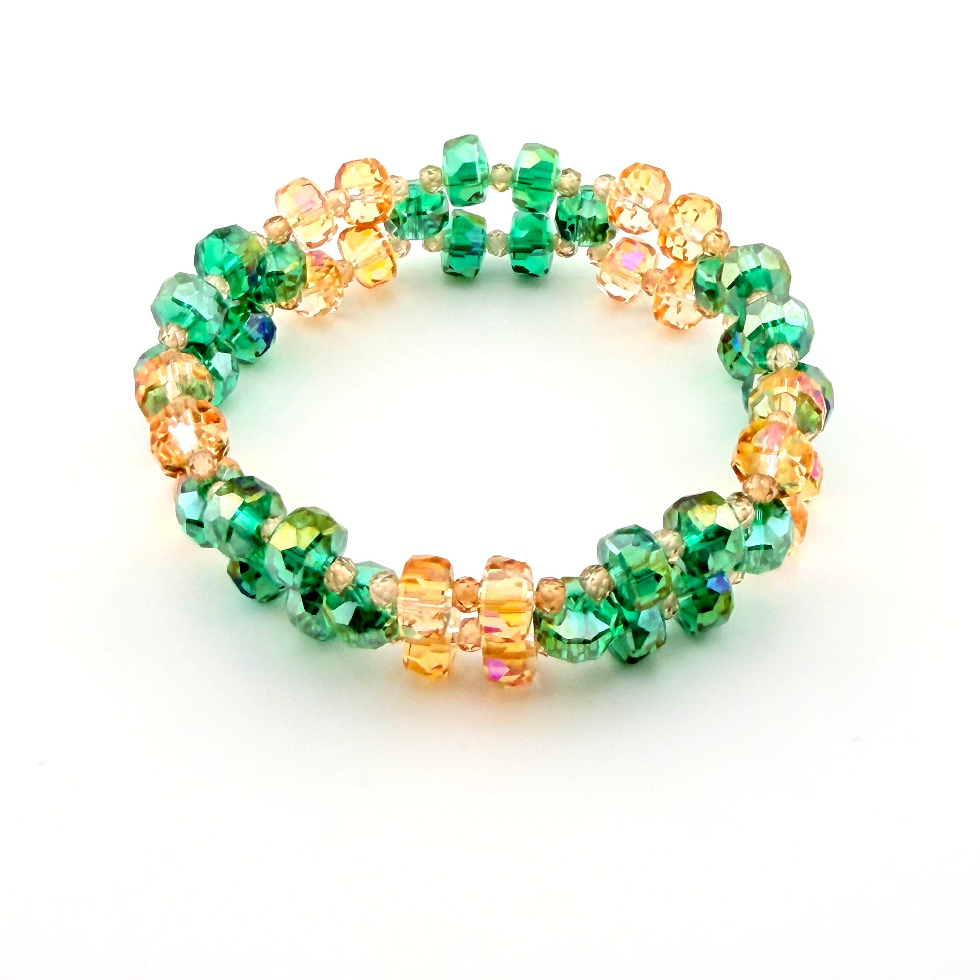 - High-shine, faceted crystal beads in green and golden-peach